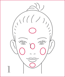 取1次的使用量,分別置於臉部的5個地方(兩頰、額頭、鼻子、下巴)。