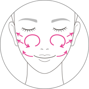 在雙頰打圈塗開後,打橫向側面推開、唇周位置由下巴向上推開。