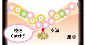 皮脂從皮溝釋出再擴散到皮丘,令肌膚變得泛油黏膩。皮脂固化球狀粉體(花王首次使用)分布於皮溝,在皮脂分泌的瞬間吸收同時固化。