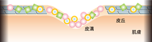 皮脂從皮溝釋出再擴散到皮丘,令肌膚變得泛油黏膩。皮脂固化球狀粉體(花王首次使用)分布於皮溝,在皮脂分泌的瞬間吸收同時固化。