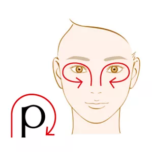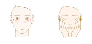 ⑤圍繞雙眼,以中指、無名指從眼皮到眼下,畫出P字使其吸收。最後以雙手輕壓全臉,達到完全吸收的效果。