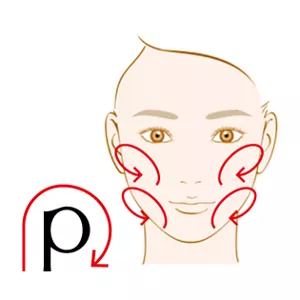 ②將臉頰的上、下部分,各以中指、無名指畫P字的方式按摩使其吸收。